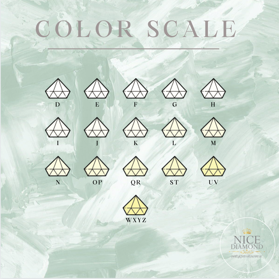 สีของเพชร หรือที่เราเรียกกันว่า “น้ำเพชร” มี 5 ระดับใหญ่ด้วยกัน Colorless ไม่มีสี (D-F) Near colorless นวล (G-J) faint นวลมาก (K-M) Very light เหลือง (N-R) light เหลืองมาก (S-Z)